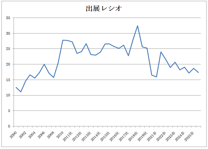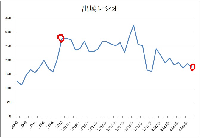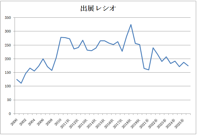 試しに来場者の数を出展者の数で割った値(出展レシオと名付けます)をグラフ化してみるとこんな感じです。