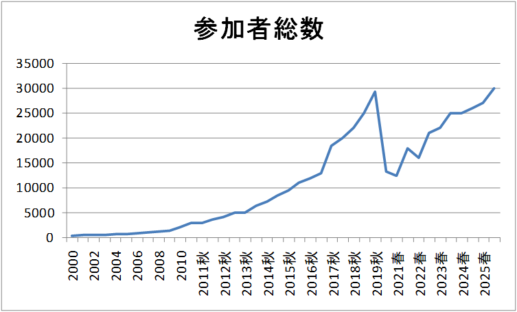コチラはゲームマーケットの来場者の推移グラフです。(2日開催の場合は合算。)