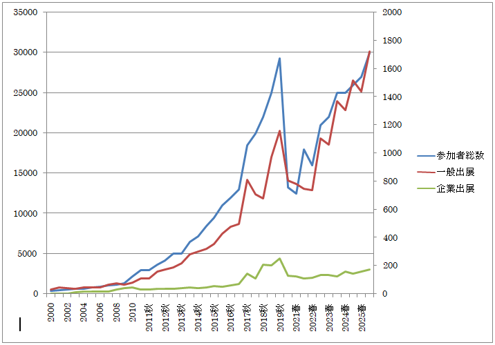 参加者総数と出展者数はどちらもすごい右上がりになってますよね。